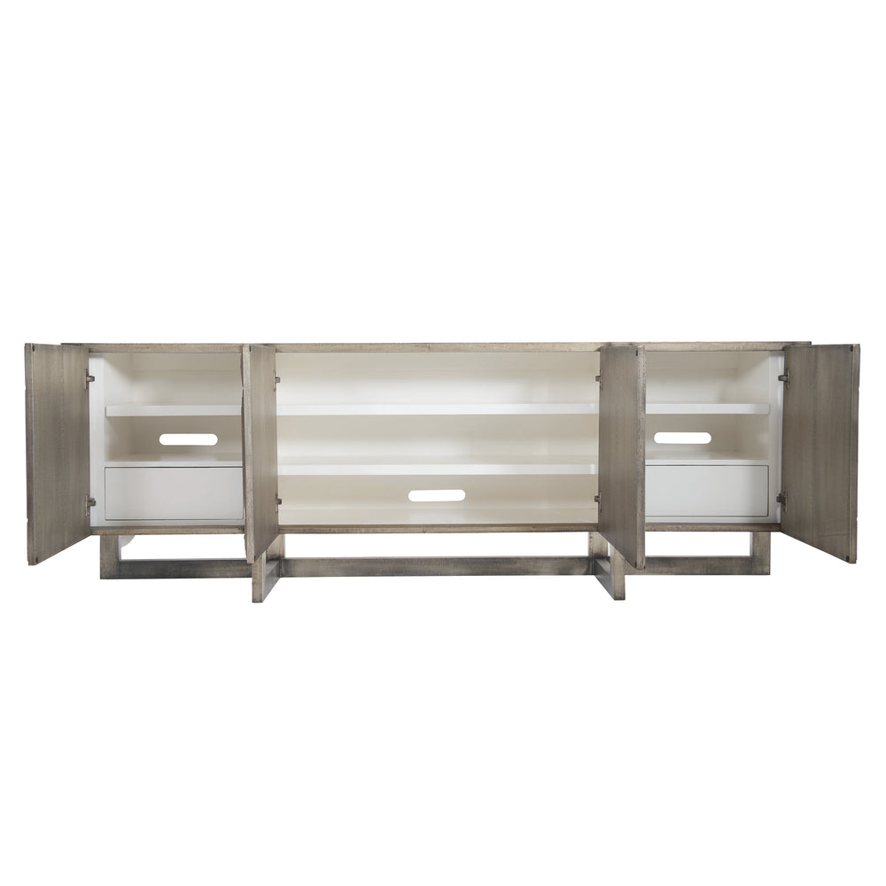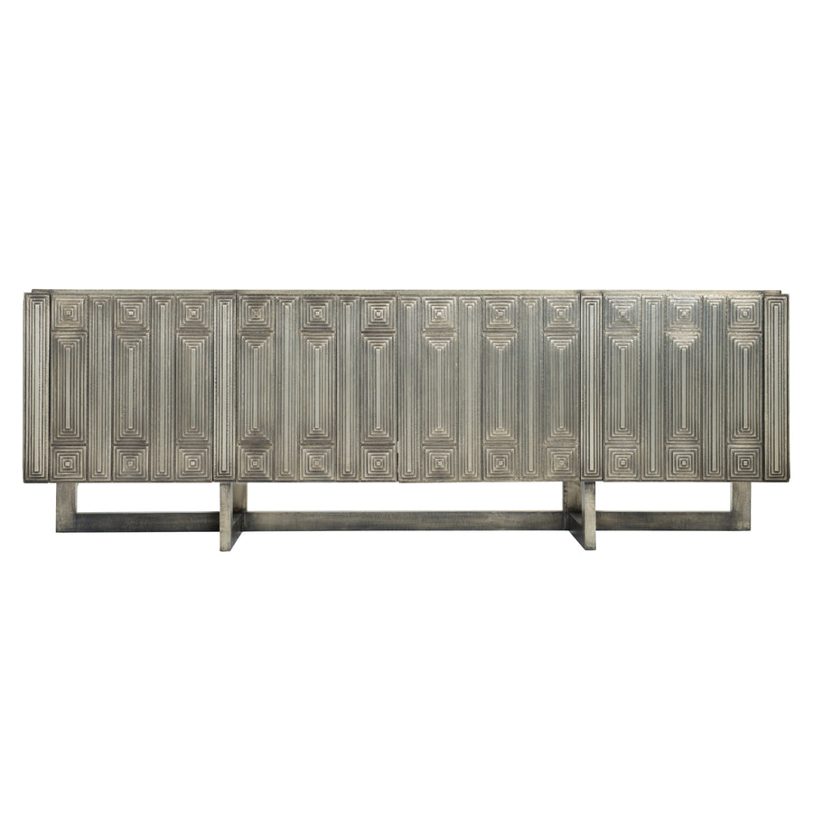 Bernhardt Interiors offers high-design furniture with an eclectic edge. A captivating statement piece, the Mackintosh entertainment credenza features a reclaimed teak case wrapped in tarnished German silver. A dramatic three-dimensional geometric pattern lends this piece a vintage glamour reminiscent of Art Deco design. An open base with clean, modern lines provides a bold contrast to the layers of dimension and texture on the case.
