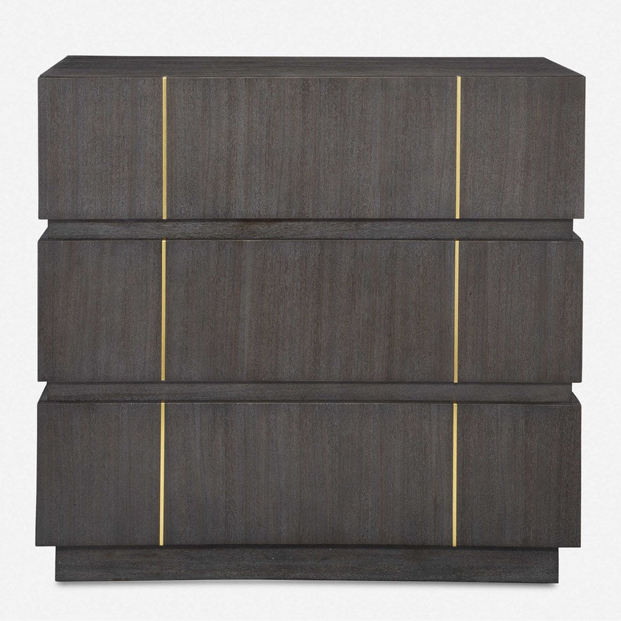 A clean and refined accent chest featuring three acacia veneer drawers in dark walnut. The richness of the wood grain is brought to life by stunning brass finished accents.