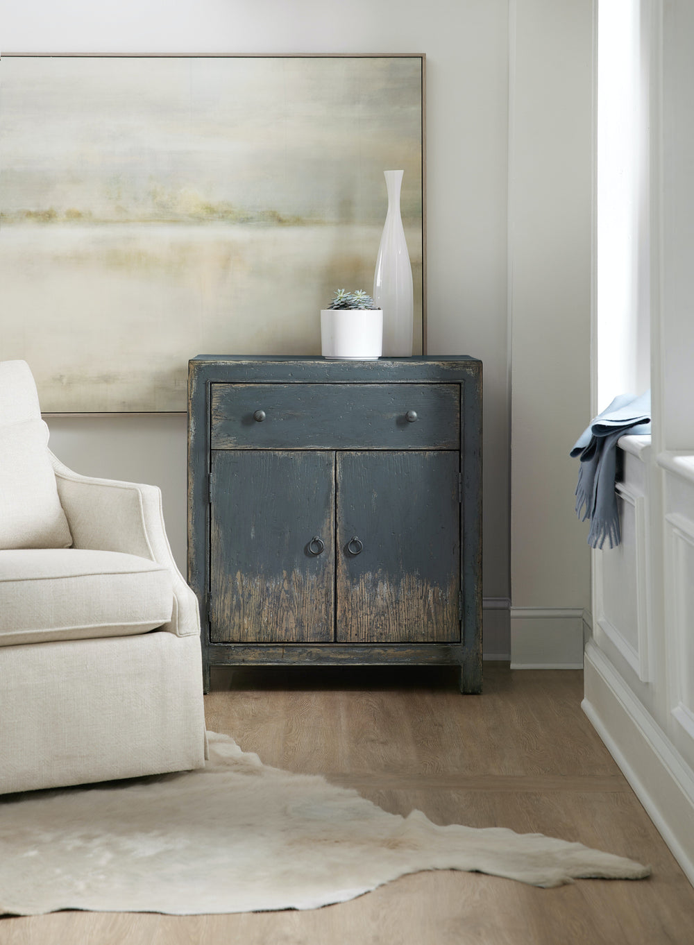 Like a treasured collected antique, the Castelle Accent Chest is alluring in its simple sophistication. The finish is a heavily distressed aged blue with dry brushing and rub-through with matching blue painted hardware. One drawer and two doors with an adjustable wood shelf.