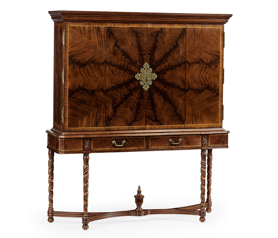 Crotch mahogany TV cabinet with four hinged doors, the veneers in a striking radiating pattern, set with finely cast patinated brass escutcheons, on a base with two drop-front drawers and turned column supports above intersecting stretchers with urn finia