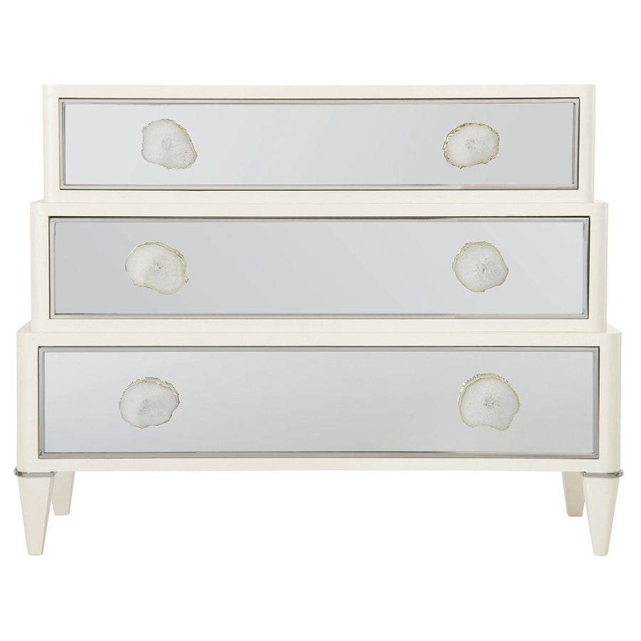 An imaginative example of transitional design, the Calista desk bestows surprises with a variety of design flourishes and subtle touches. Floral hardware in a Polished Nickel finish adds feminine appeal, while vertical stainless steel rods bring movement to the piece. Featuring a linear grain, the ash veneers are enhanced by a Silken Pearl finish for a look that is modern and clean.