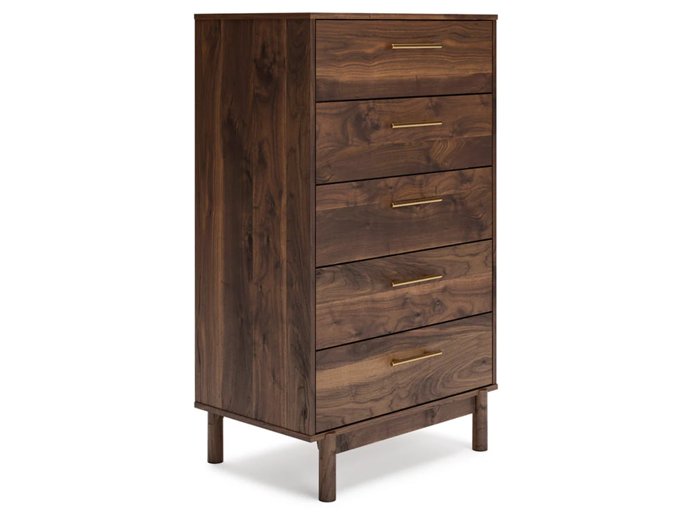 At the intersection of industrial cool and chic sophistication, you’ll find the Calverson chest of drawers. With a rich brown finish over replicated walnut wood grain, paired with burnished goldtone handles, it offers an authentic touch that plays well any way you style it. Simple and elegant in its design, this piece keeps your home decor grounded while elevating your modern style.