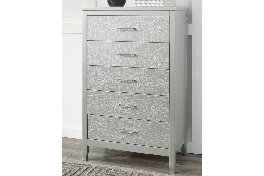 A touch of Old Hollywood reserved for the high-fashion starlet. Stealing the show with its glamorous good looks and upscale attitude, the Olivet chest of drawers is red carpet style made highly affordable. Distinctive elements include a silvertone metallic finish, chrome-tone pulls with encrusted faux crystals and faux shagreen drawer fronts for a rich textural twist.