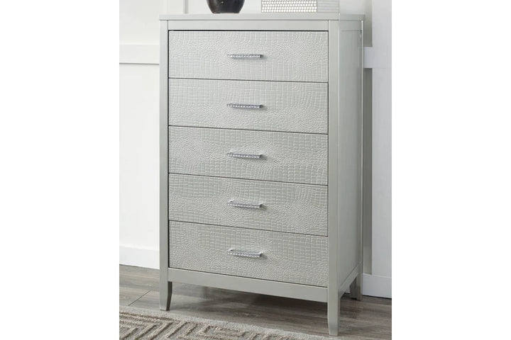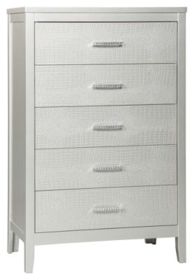 Made of wood and engineered wood;Chrome-tone pulls with decorative faux crystals;Silvertone metallic finish;5 smooth-gliding drawers;Small Space Solution;Includes tipover restraint device