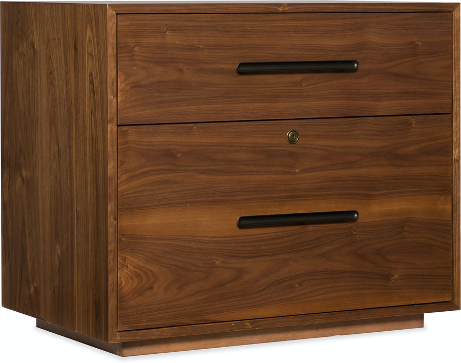 With a craftsman flair and quality, the Elon Lateral File is crafted of Flat Cut Walnut Veneers with a satin medium wood finish and dark bronze metal bar pulls. The top drawer is a utility drawer, while the bottom drawer is a locking file drawer with pendaflex letter/legal filing system. Can be bunched with other 1650 Elon office items for a modular configuration or used alone.