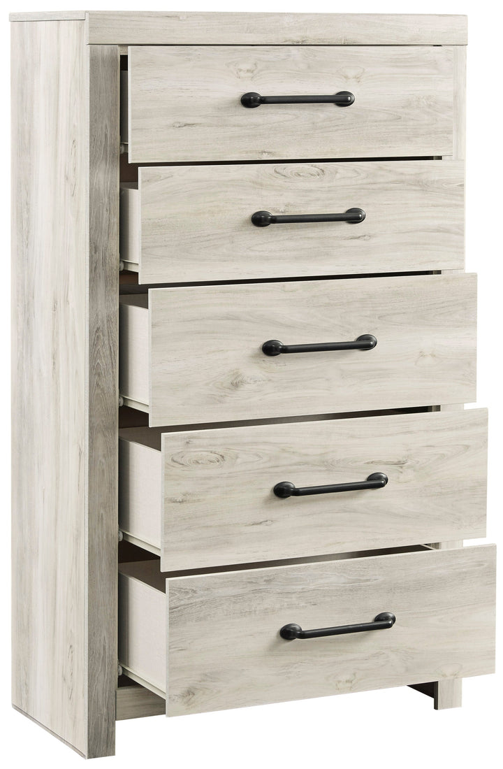 Made of engineered wood (MDF/particleboard);and decorative laminate;Wispy white finish over replicated oak grain with authentic touch;Dark-tone industrial hardware;5 smooth-gliding drawers;Drawer interiors are lined with a faux linen laminate for a clean finished look;Safety is a top priority, clothing storage units are designed to meet the most current standard for stability, ASTM F 2057 (ASTM International);Drawers extend out to accommodate maximum access to drawer interior while maintaining safety