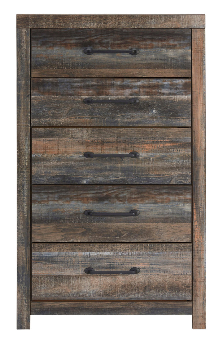Made of engineered wood (MDF/particleboard) and decorative laminate;Brown rustic finish with burnt orange and teal accents in a replicated wood grain with authentic touch;Dark-tone industrial hardware;5 smooth-gliding drawers;Drawers lined with faux linen laminate;Includes tipover restraint device;Small Space Solution;Safety is a top priority, clothing storage units are designed to meet the most current standard for stability, ASTM F 2057 (ASTM International);Drawers extend out to accommodate maximum access to drawer interior while maintaining safety