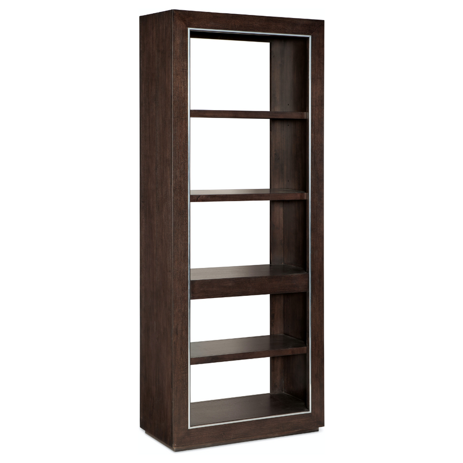 Add stylish storage to any space with the House Blend Etagere with the sleek combination of a Dark Roast finish over Quartered Ash Veneers and silver metal trim. Measuring 30 ¾ inches wide by 14 inches deep, the etagere is versatile for many spaces and features 3 adjustable wood shelves and one fixed shelf.