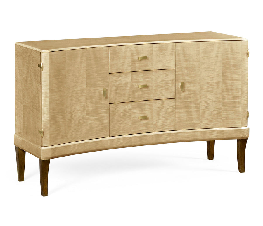 Art Deco inspired sideboard with concave front. Finished in a high lustre champagne sycamore. Three drawers and two cupboards all with geometric brass handles and hinges, and raised on ebonised curved legs. Stainless steel handles are available, please specify with your order. (Old salescode: 494326-GSH-BRS)