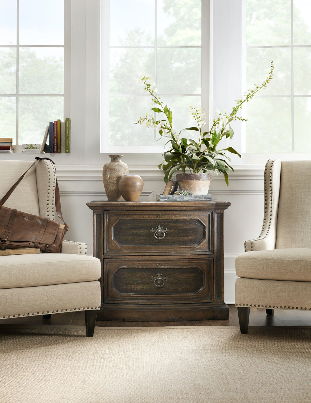 Who would know this charming and character-filled piece is a lateral file cabinet with two locking file drawers with letter/legal filing systems? Use it as an accent, living room or bedroom piece or in your office. The timeworn saddle brown finish is paired with an aged black finish, and the custom crafted hardware in an aged pewter finish with shaped back plates gives the finishing touch.