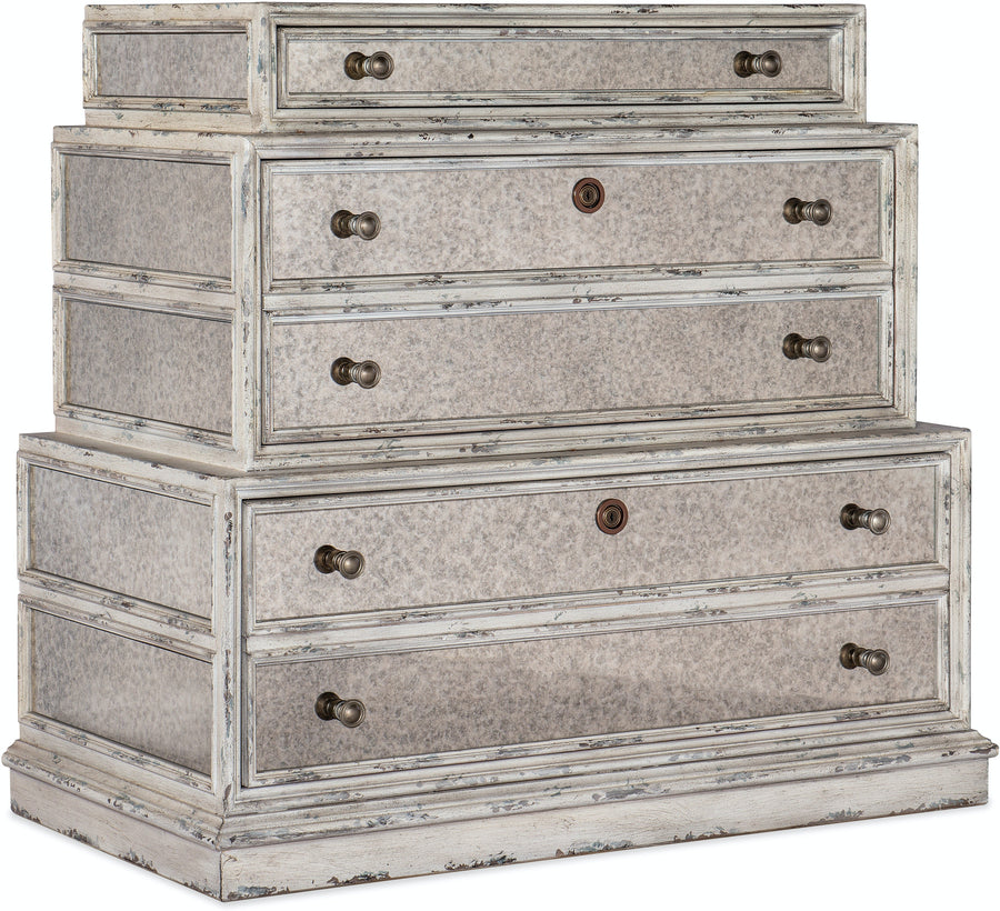 Crafted with poplar and hardwood solids with maple veneers with antique mirror and resin this writing desk features One utility drawer with four removable dividers that provide six storage compartments; two locking file drawers with pendaflex letter/legal filing system; the bottom drawer will accommodate two rows of legal files.