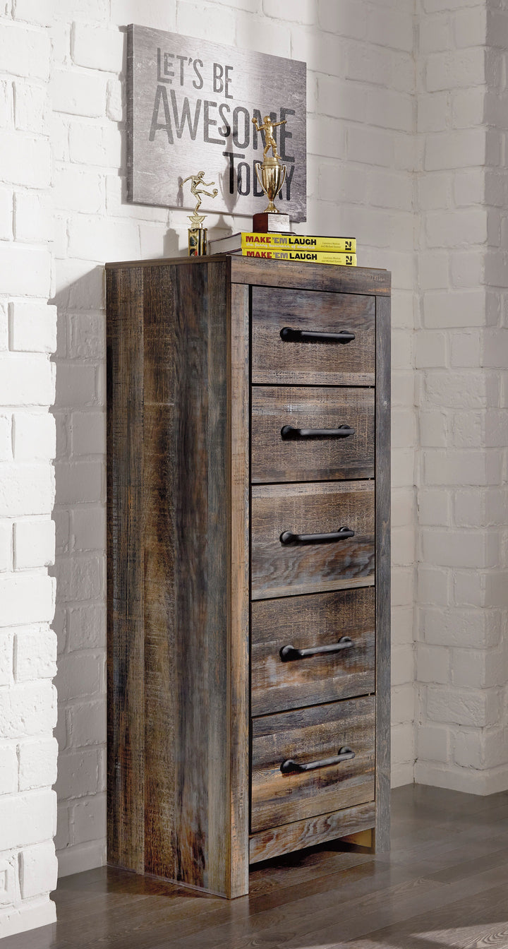 Made of engineered wood (MDF/particleboard) and decorative laminate;Brown rustic finish with burnt orange and teal accents in a replicated wood grain with authentic touch;5 smooth-gliding drawers;Drawers lined with faux linen laminate;Dark-tone industrial hardware;Small Space Solution;Includes tipover restraint device;Safety is a top priority, clothing storage units are designed to meet the most current standard for stability, ASTM F 2057 (ASTM International);Drawers extend out to accommodate maximum access to drawer interior while maintaining safety