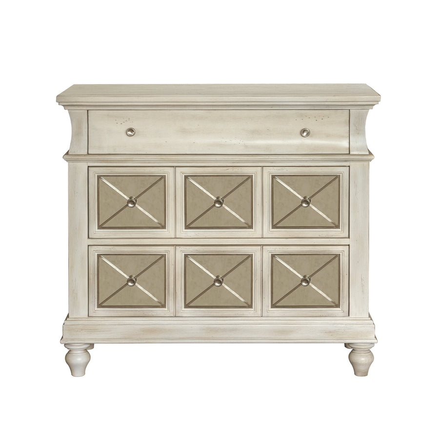 The timeless style is accented with beveled details and bun feet.,Three drawers make for perfect storage from bed linens, to mail and chargers,Bottom drawers are painted with a pearl finish,Brushed nickel hardware knobs,Constructed of select hardwoods, birch veneers, and antique mirror,Minimal assembly required.