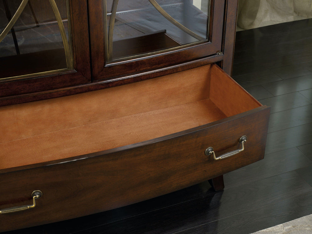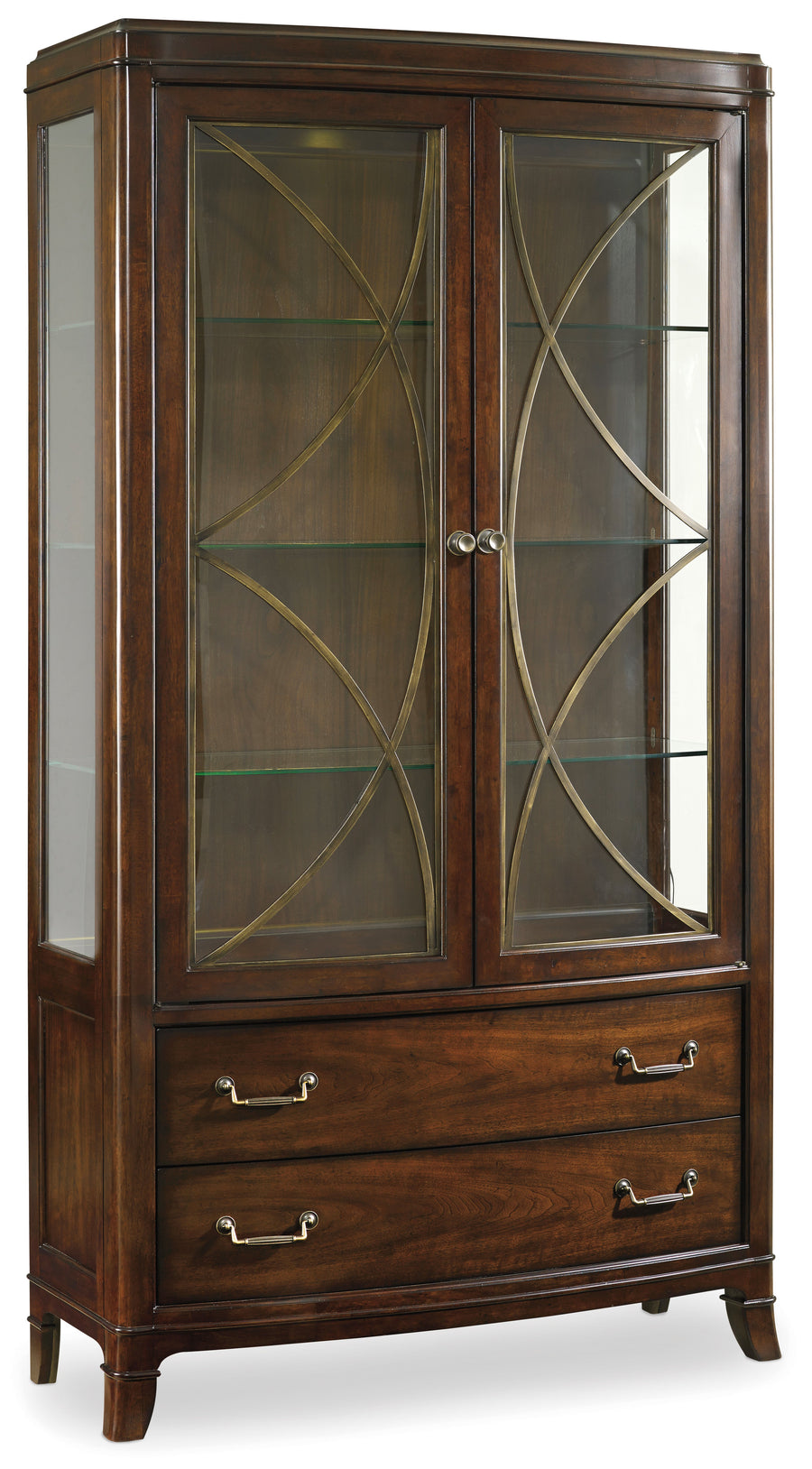 Crafted in highly figured Walnut Veneers with lovely metal fretwork over two wood-framed glass doors, the Palisade Display Cabinet is a classic beauty with a fresh modern flair. As functional as it is fashionable, the cabinet has 3 adjustable glass shelves with plate grooves behind the doors and two drawers.