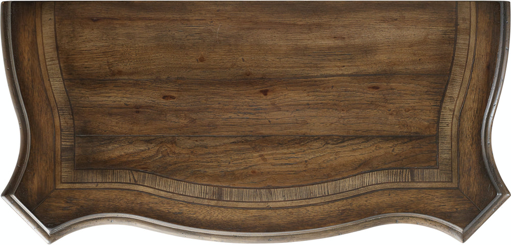 The Rhapsody Five Drawer Chest brings together classic style elements and a relaxed, rustic finish in an impassioned marriage of casual opulence. Exuberant design motifs such as acanthus leaf molding around the base, column motifs on the sides of the case and ornate bun feet infuse the piece with emotion. The walnut-colored finish is inspired by the rustic nature of reclaimed woods in beautiful patinas. The bottom drawer is cedar-lined.