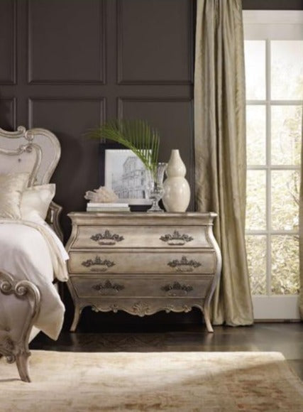 Enchanting and uplifting, this curvy three-drawer bombe-shaped chest is inspired by an 18th Century French Antique and adorned with an elegant silver leaf finish with slightly aged patina and opulent hardware.
