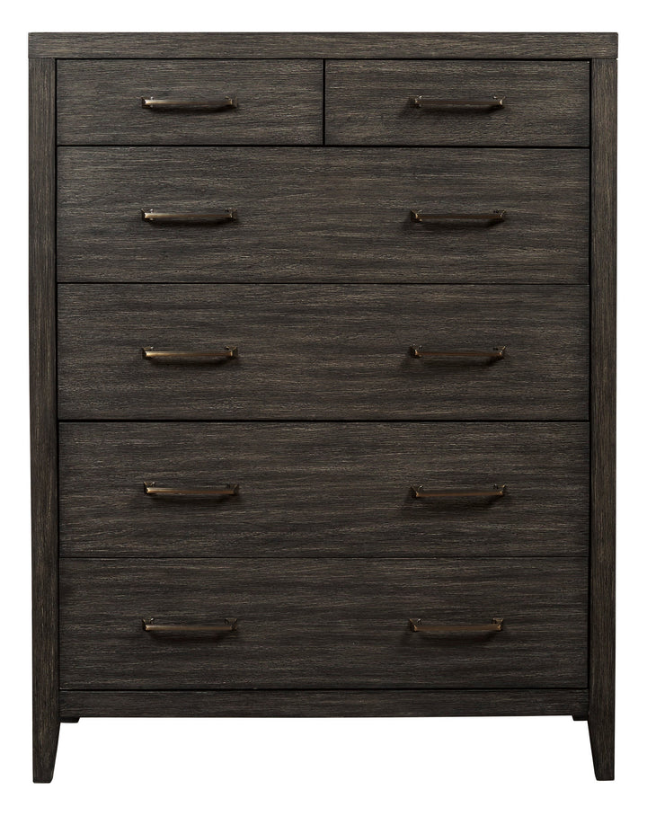 Made of acacia wood, oak veneer and engineered wood;Blackened effect finish with contrasting gray undertones and wire-brushed texture;Antiqued bronze-tone hardware;6 smooth-gliding drawers with dovetail construction;Top drawers felt-lined
