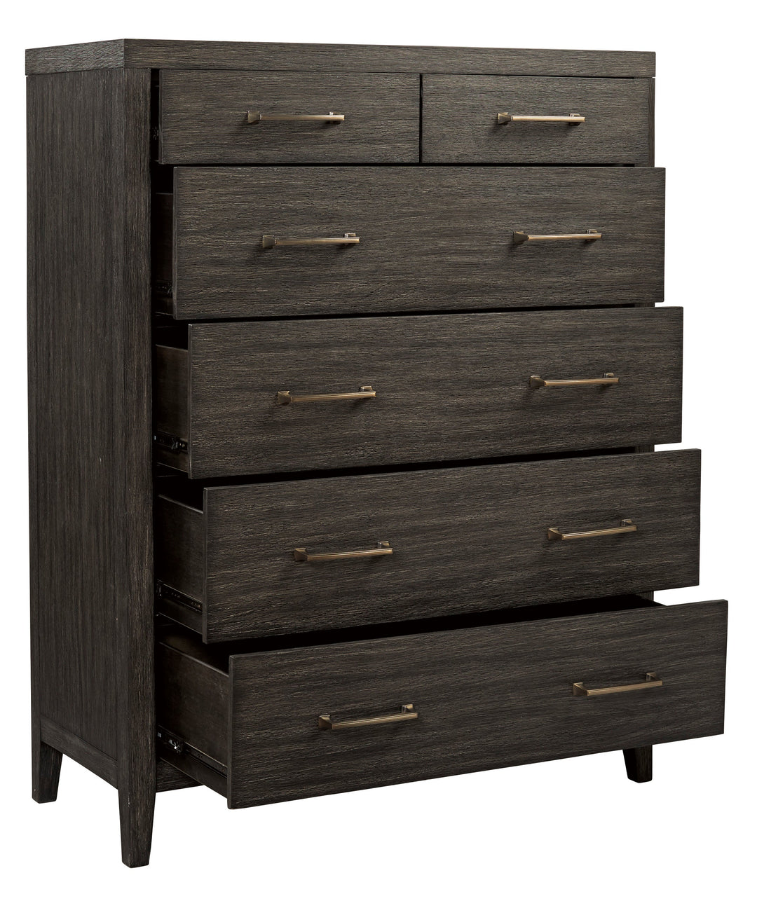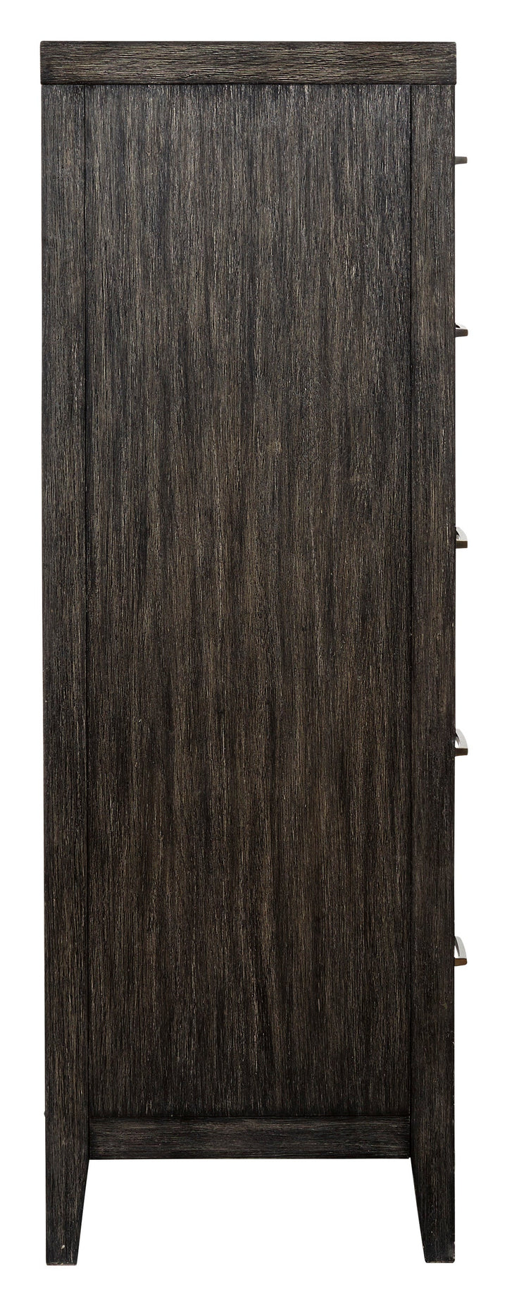 Few pieces demand attention like the Bellvern chest of drawers. Those drawn to the earthy character of the wire-brushed texture—with a complex, multi-layered finish—can appreciate the beauty and craftsmanship of this bedroom essential. In addition to its acacia wood and oak veneer construction, clean contemporary lines and simple symmetry have a minimalist appeal that fits perfectly in an upscale transitional setting.