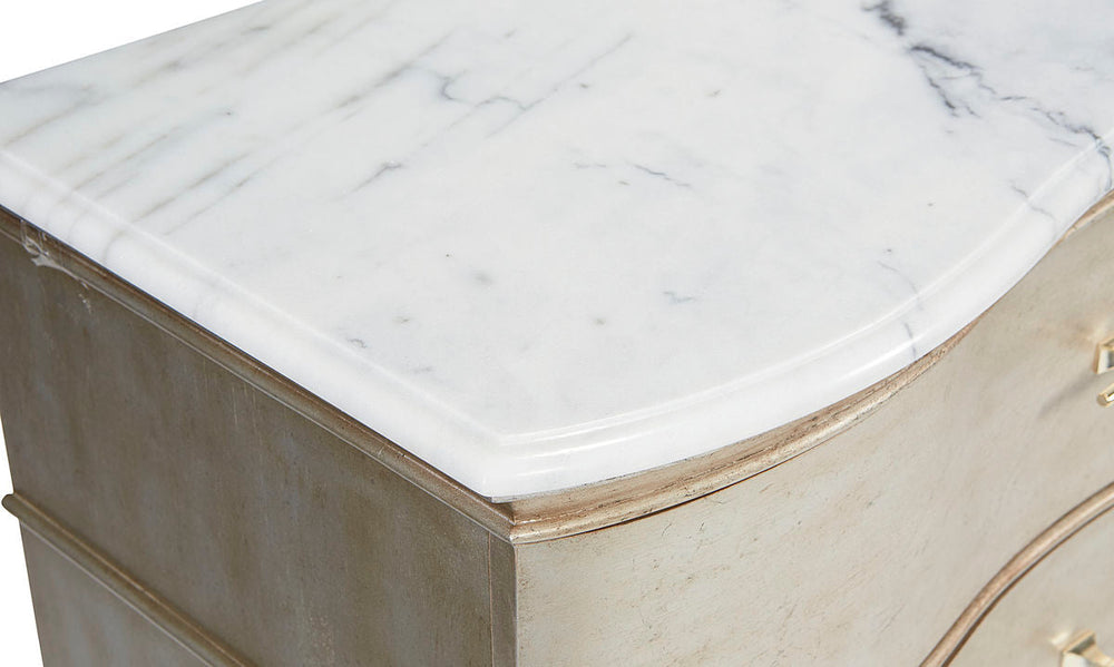 The handsome Starlite Bachelor Chest has three roomy drawers set into a gently curved serpentine front. The top of the chest is highly figurative polished stone; the body is finished with silver Bezel paint that has been glazed and gently aged for a soft sheen.