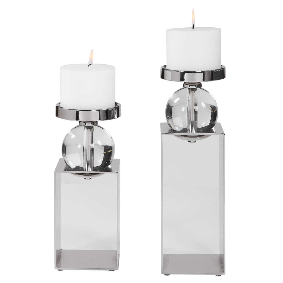 Set Of Two Candleholders Featuring An Open Steel Frame, Finished In Polished Nickel With Crystal Accents. Two 4"x 3" Distressed White Candles Included.
