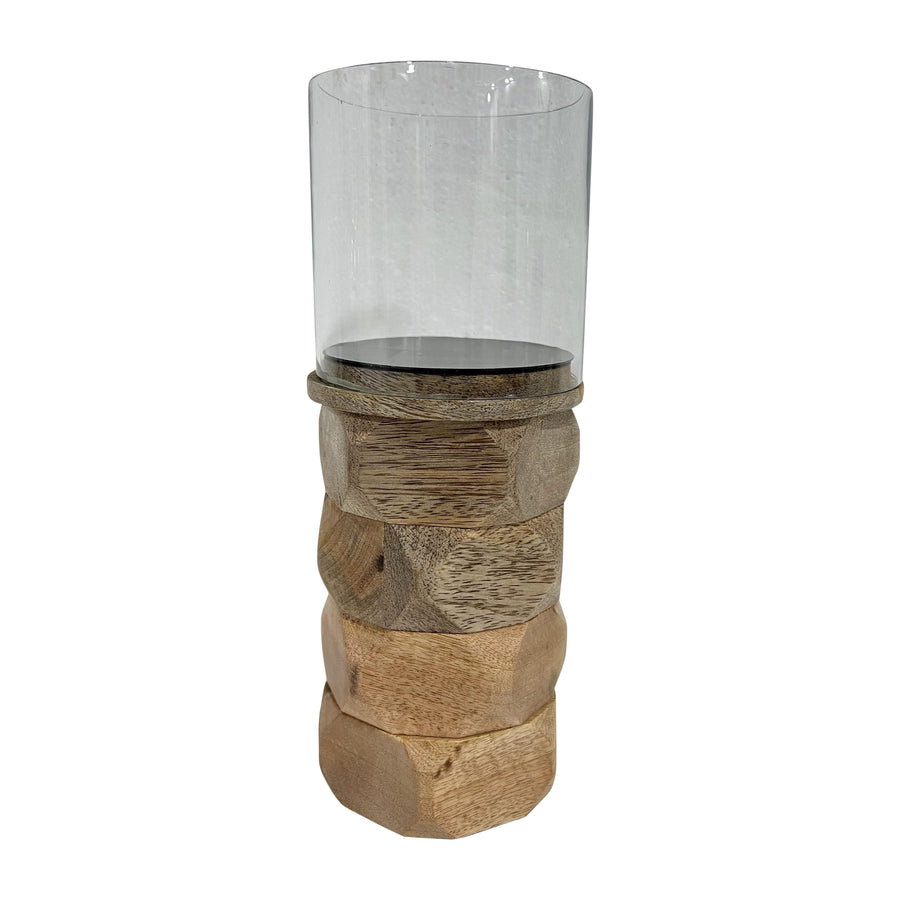 WOOD, 10" STACKED HEXAGON PILLAR HURRICANE, NATURA