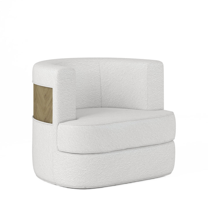 | Features | Barrel style swivel chair features a tight back and loose seat cushion, Seat cushion construction features layerd foam in a polybag, Outside back features a curved, herringbone veneer patterned panel in a Washed Oak finish, 360-degree metal swivel base |