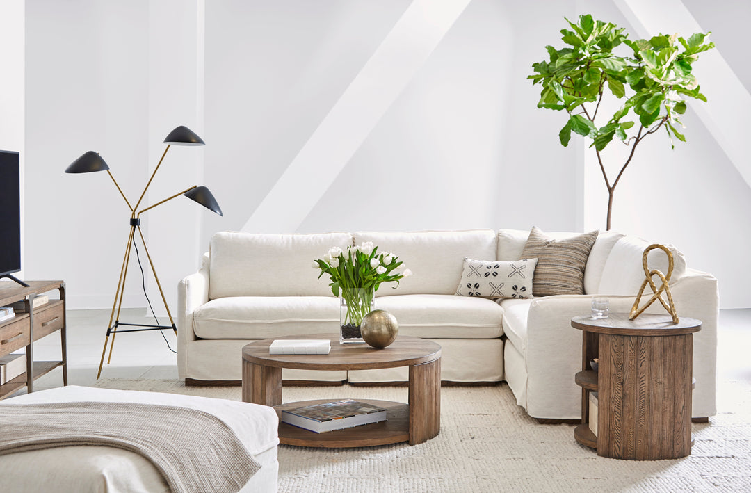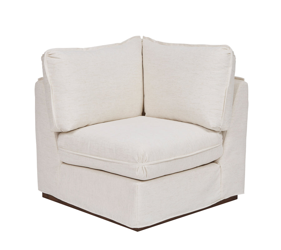 This modern corner chair features a fitted slipcover in a luxurious, vanilla-hued linen blend, over a solid ash frame in a light oak finish. The back cushion is filled with a down blend, and the seat cushion is spring down over sinuous coil construction. It can be combined with the Alias LAF, RAF and Armless Chair to form the Alias Sectional in 2, 3, 4 or 5 pieces.