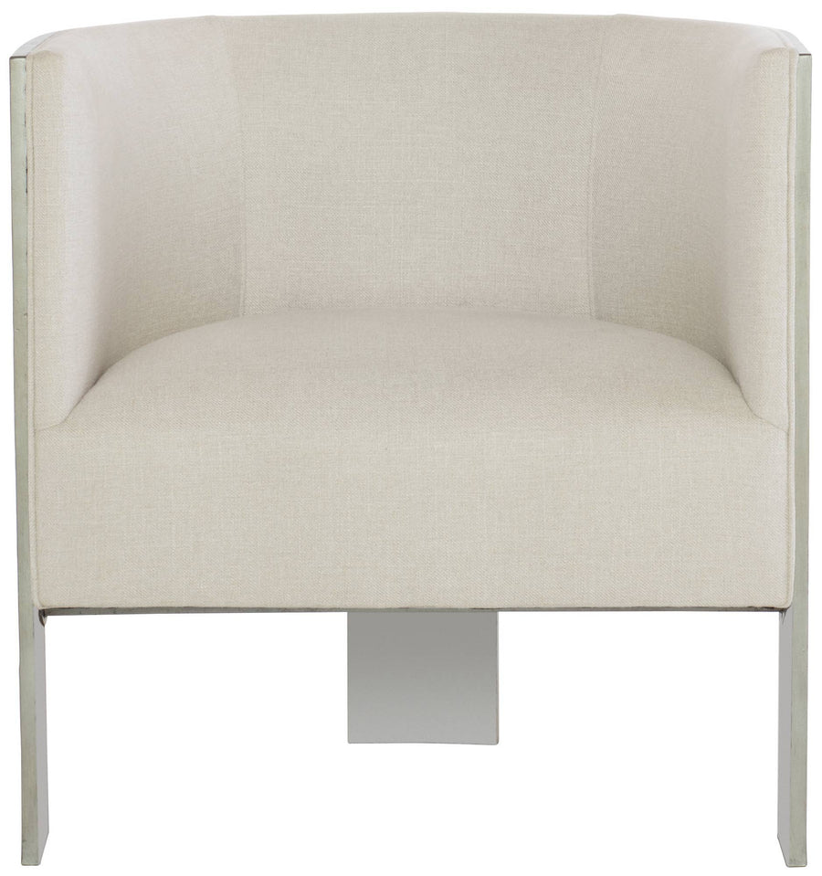 The Cosway chair is a unique, contemporary interpretation of the classic barrel chair. The curved frame wraps around the upholstery and extends three wide legs to the floor. Finished in antique silver with a wood grain texture, it achieves a glamorous, organic appeal. The curved shape of this chic chair provides luxurious support and softens the flow of a room.