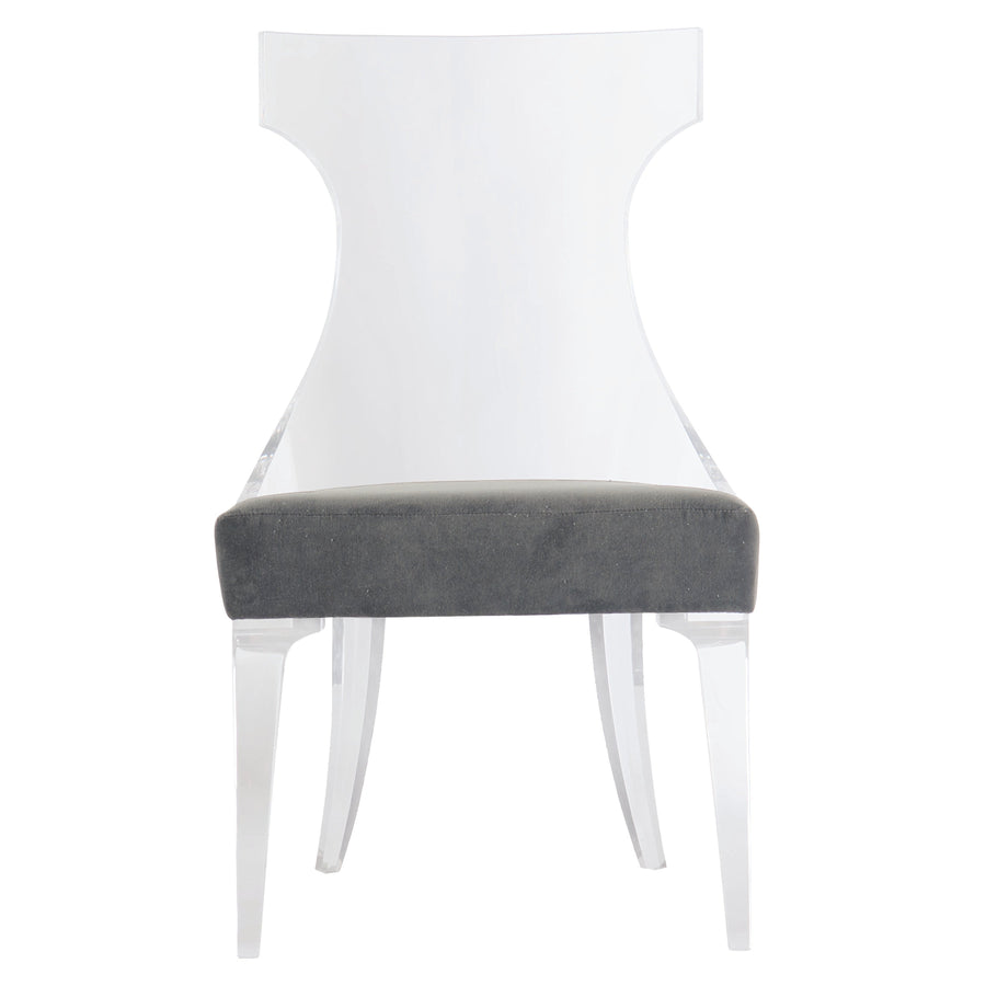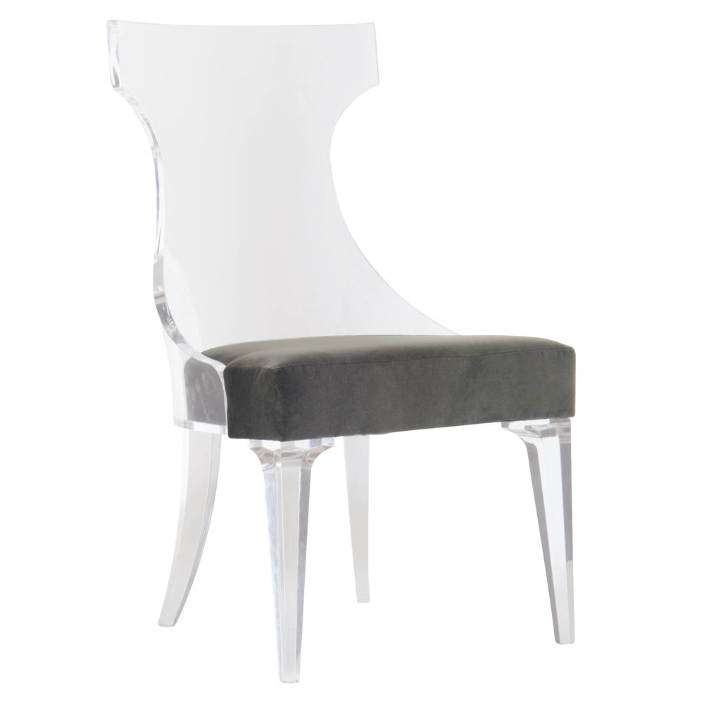 Inspired by the classic Greek klismos chair, the Tahlia side chair showcases an elegant hourglass back with subtle wings crafted from acrylic. An upholstered seat appears to float above acrylic tapered legs which are straight in the front, splayed in the back. This sophisticated modern chair is available in a variety of fine fabrics.