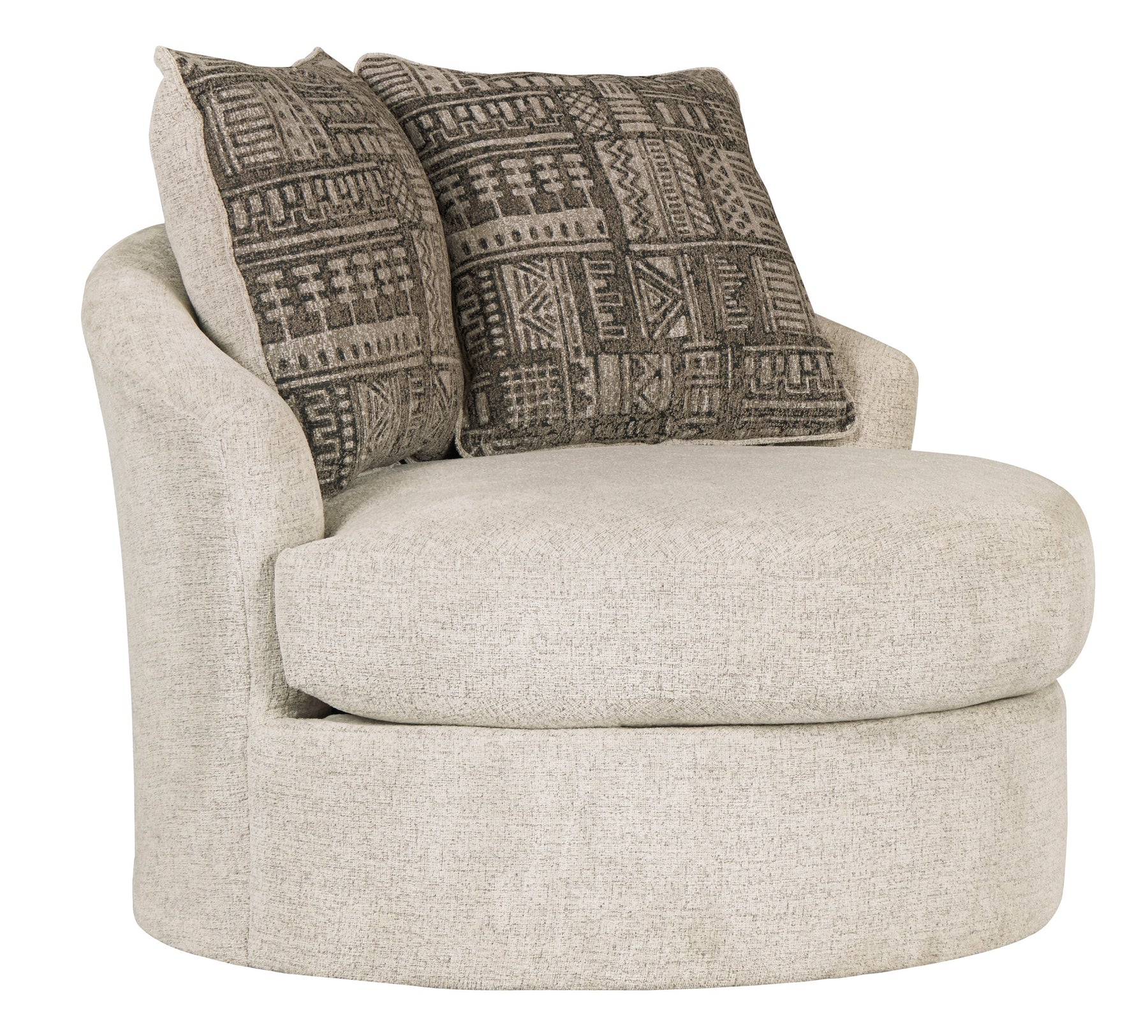 Flaunting a trendsetting silhouette, the Soletren swivel accent chair puts the contemporary in your contemporary home. Its 360-degree swivel gives you an around-the-room view to complement your comfort. Chunky chenille fabric satisfies your need for a piece that feels as good as it looks. Accented with soft jacquard chenille throw pillows for a splash of geometric pattern and color contrast.