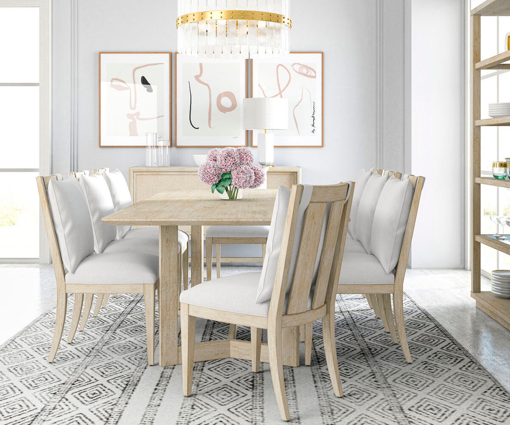 This side dining chair from the Cotiere collection is inspired by updated mid century modern design, from its tapered legs to the back featuring a pair of broad vertical supports. Crafted from parawood solids and ash veneers in a light gray shale tone, the chair is finished in a finely tailored linen blend fabric, complete with a fully upholstered back cushion for maximum comfort.