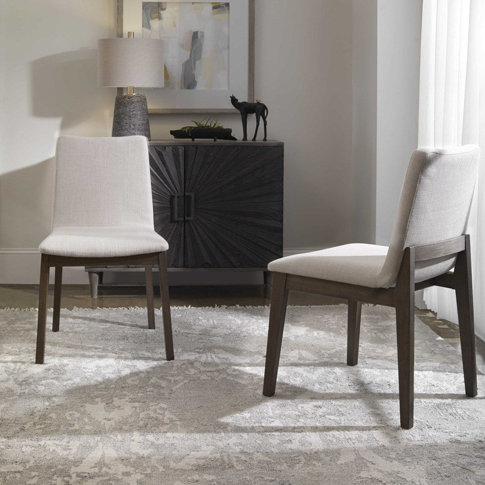 Gently sloped padded seat in a crisp white polyester blend fabric with a protected finish that resists soiling and stains. Rests within a solid wood frame finished in rich walnut. Seat height is 20". Packed 2 per box but priced individually. Must be purchased in increments of 2.