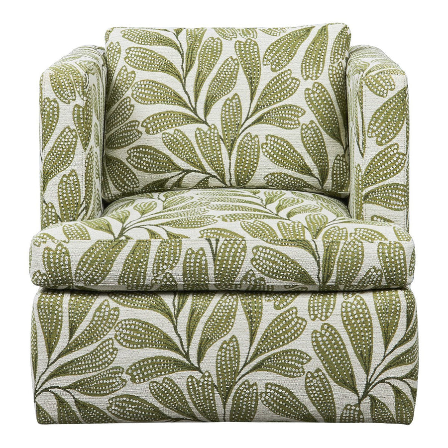 Cocoon yourself in this comfortable raised track arm chair that swivels. The hardwood frame has been wrapped in 100% cotton, then the cushions of Ultracel foam have been wrapped in Trillium, giving it all the properties and comfort of down without the required maintenance. Fully upholstered in a performance fabric of off-white, low-pile chenille, the woven jacquard fabric boasts verdant leaves in shades of green and dotted white. Made in the furniture capital, High Point, NC. Seat height is 19".