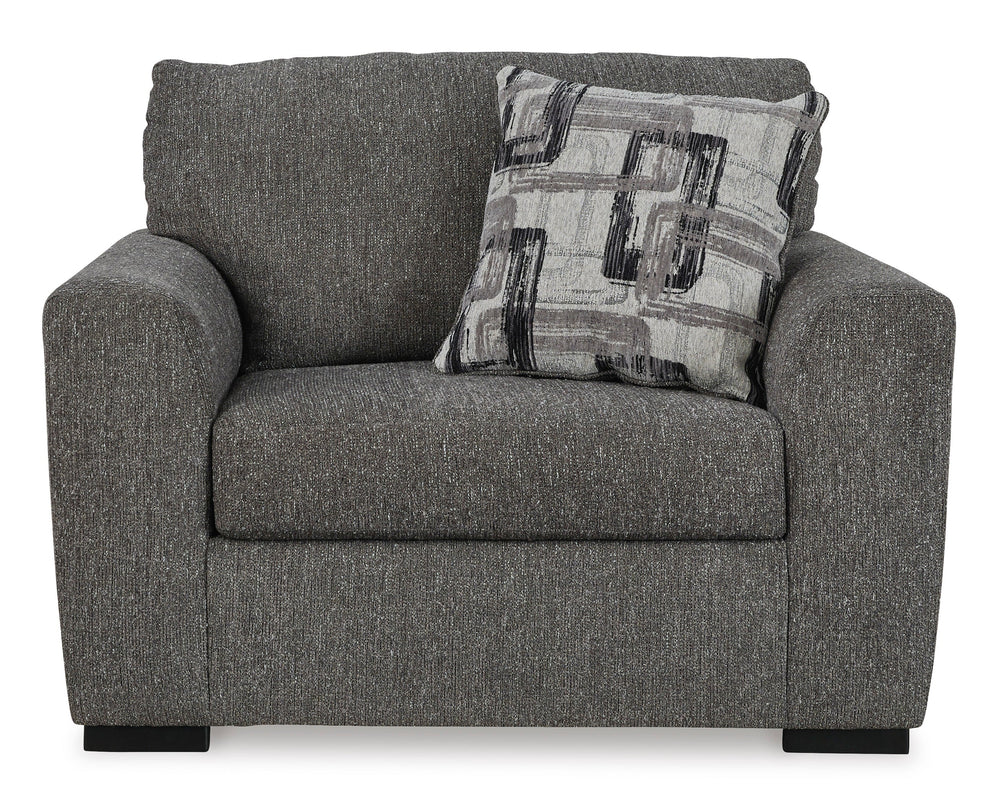 Corner-blocked frame;Attached back and reversible seat cushions;High-resiliency foam cushions wrapped in thick poly fiber;Accent pillows included;Pillows with soft polyfill;Polyester upholstery;Exposed feet with faux wood finish;Platform foundation system resists sagging 3x better than spring system after 20,000 testing cycles by providing more even support;Smooth platform foundation maintains tight, wrinkle-free look without dips or sags that can occur over time with sinuous spring foundations