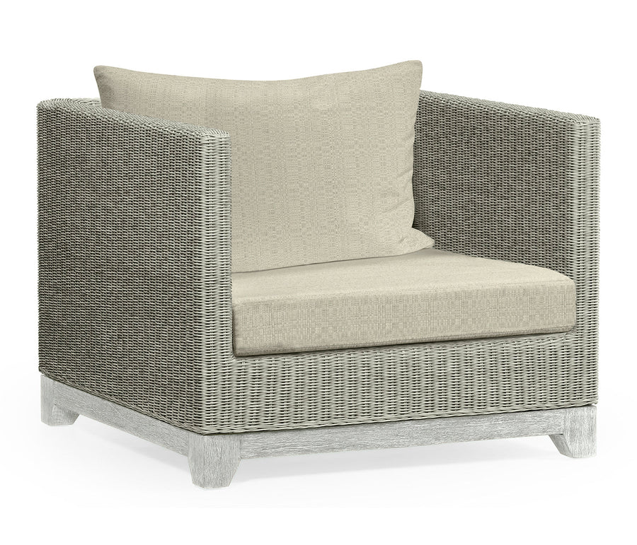 34" Cloudy grey and light grey rattan chair, upholstered in standard outdoor fabric.