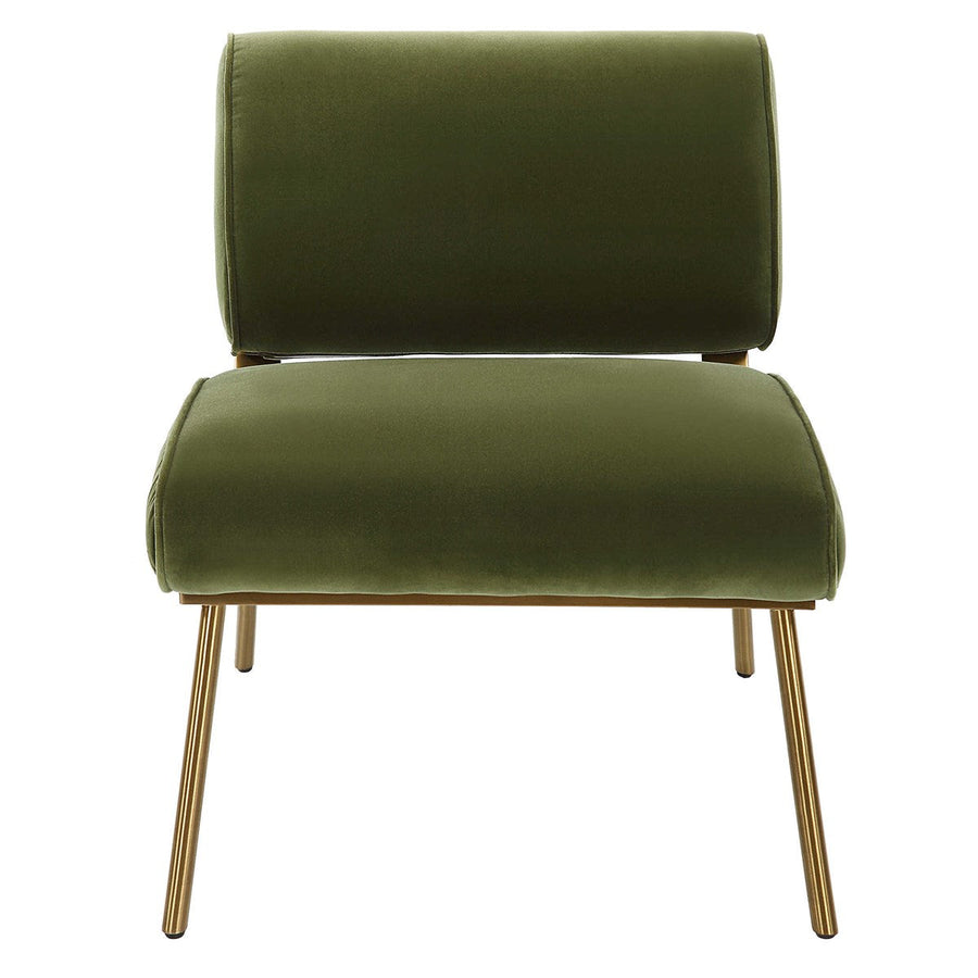 Bold mid-century style is elevated with the dramatic back of the Knoll Accent Chair. Crafted from stainless steel in brushed brass with button accents. Upholstered in a smooth olive green polyester velvet. Seat height is 18".