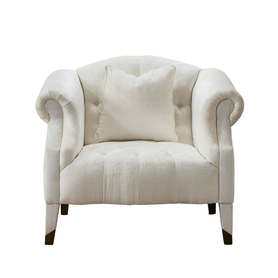 An opulent Living Room Chair by Roots Furniture made to impress and provide comfort. Designed by the Influencer Noha Albabtain, this elegant white sofa chair with gold accents and a plush cushion adds an unmistakable lavishness to any living room.