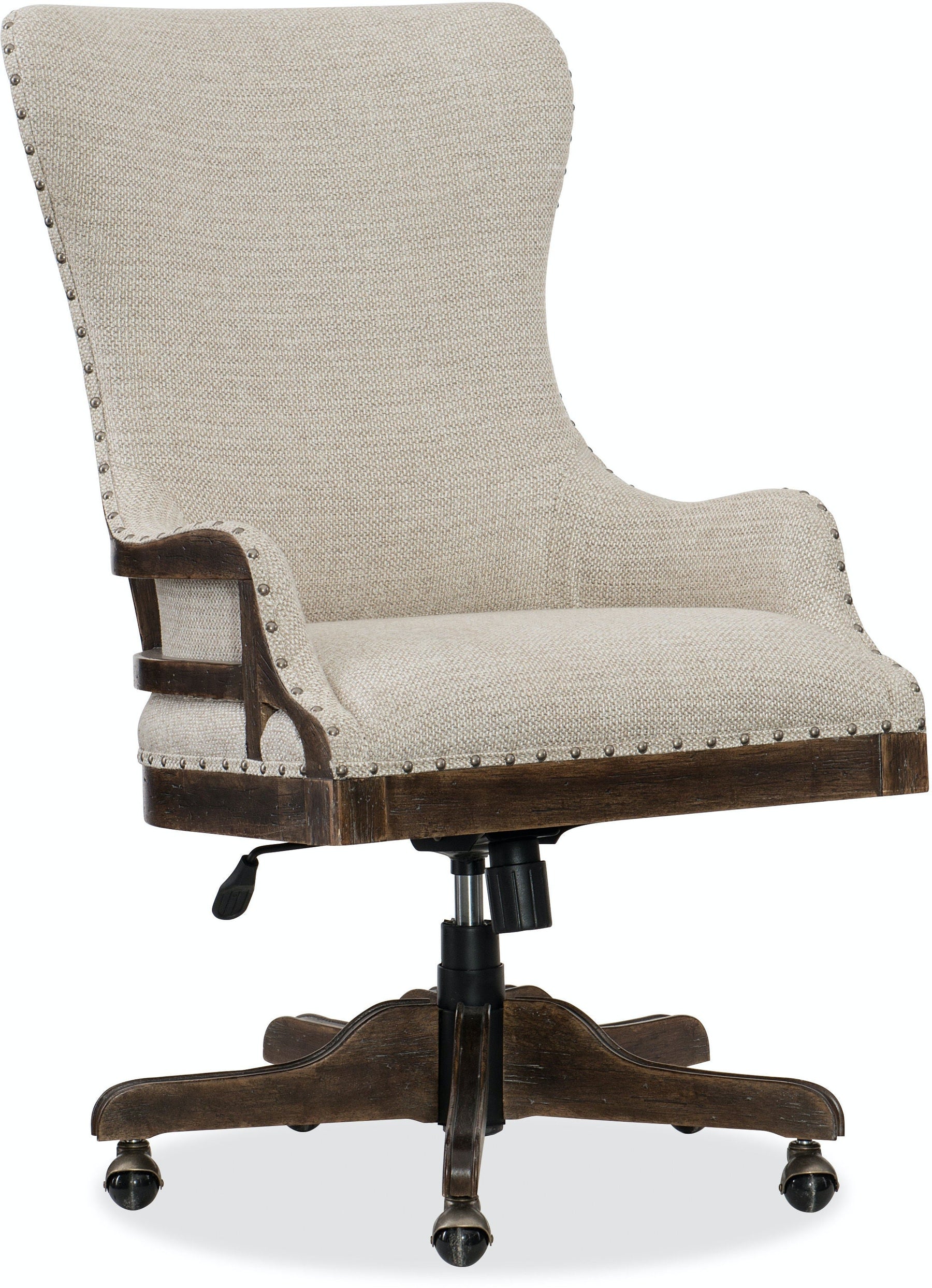 With exposed beams on the back for an authentic and approachable deconstructed look, the Roslyn County Tilt Swivel Chair epitomizes rustic chic style. The cream-colored upholstered seat and back contrasts with the Dark Walnut waxed, distressed finish. Offering a pneumatic gas lift and tilt swivel, the seat height adjusts from 19 _ inches high to 22 _ inches high.