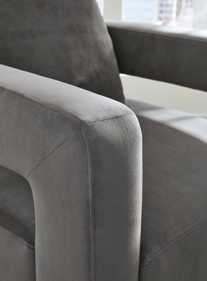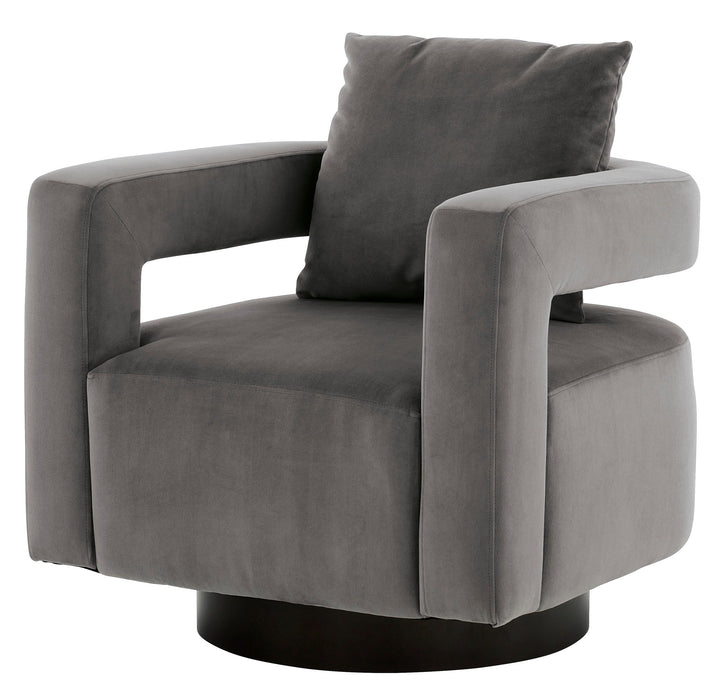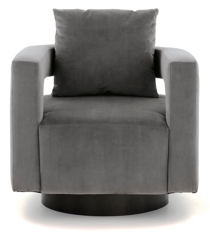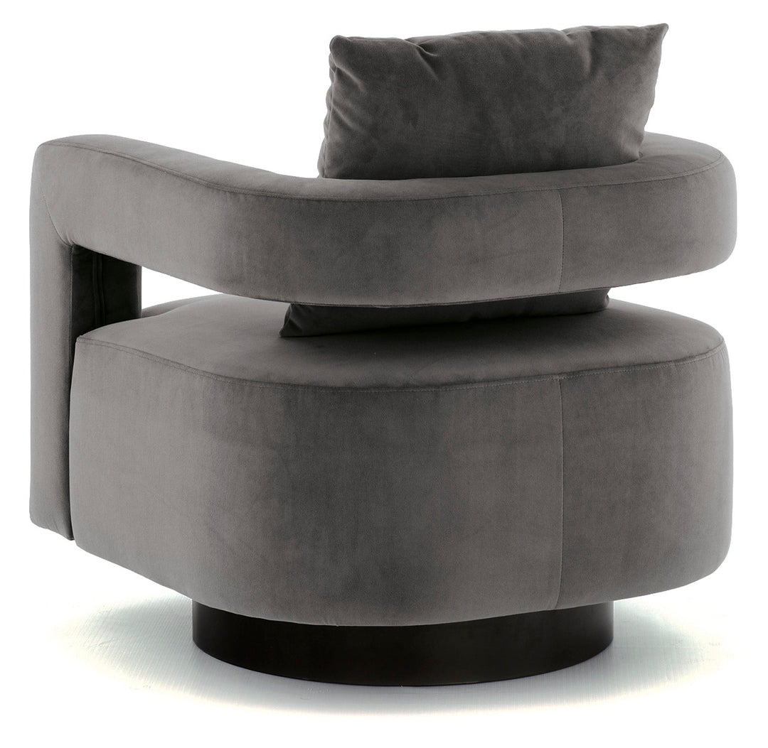 Polyester velvet upholstery in taupe;Loose back cushion and attached seat cushion;Dark bronze-tone swivel base;Easy assembly