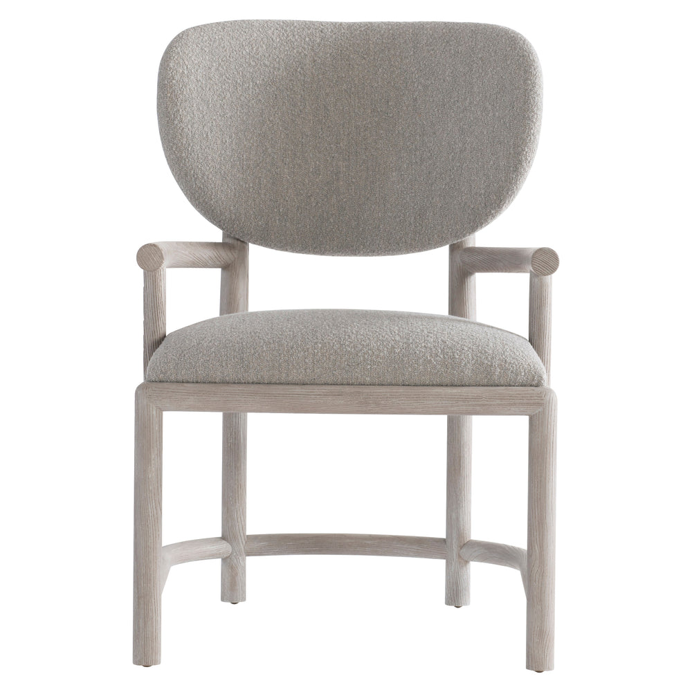 A modern organic design gives the Trianon arm chair its distinctive look. Open spaces create a sense of lightness within the bold structure of the chair's frame, including angled back legs that stretch up to the curved upholstered back. The exposed wood frame is heavily textured in the Gris finish.