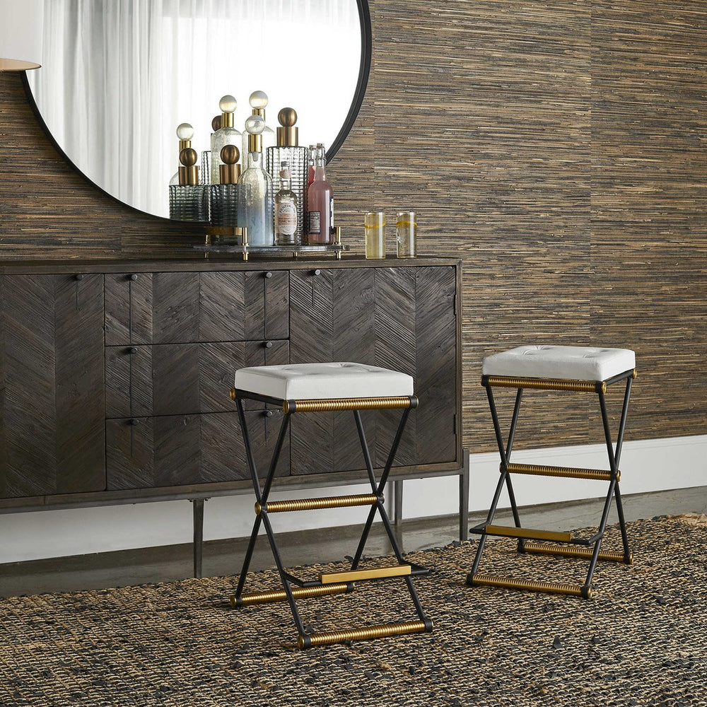 Made of dramatic and natural Panda marble with a polished finish, the organic modern shape features a rich brass finished sleeve. True to the nature of natural materials, each piece will have unique marbling and veining throughout.