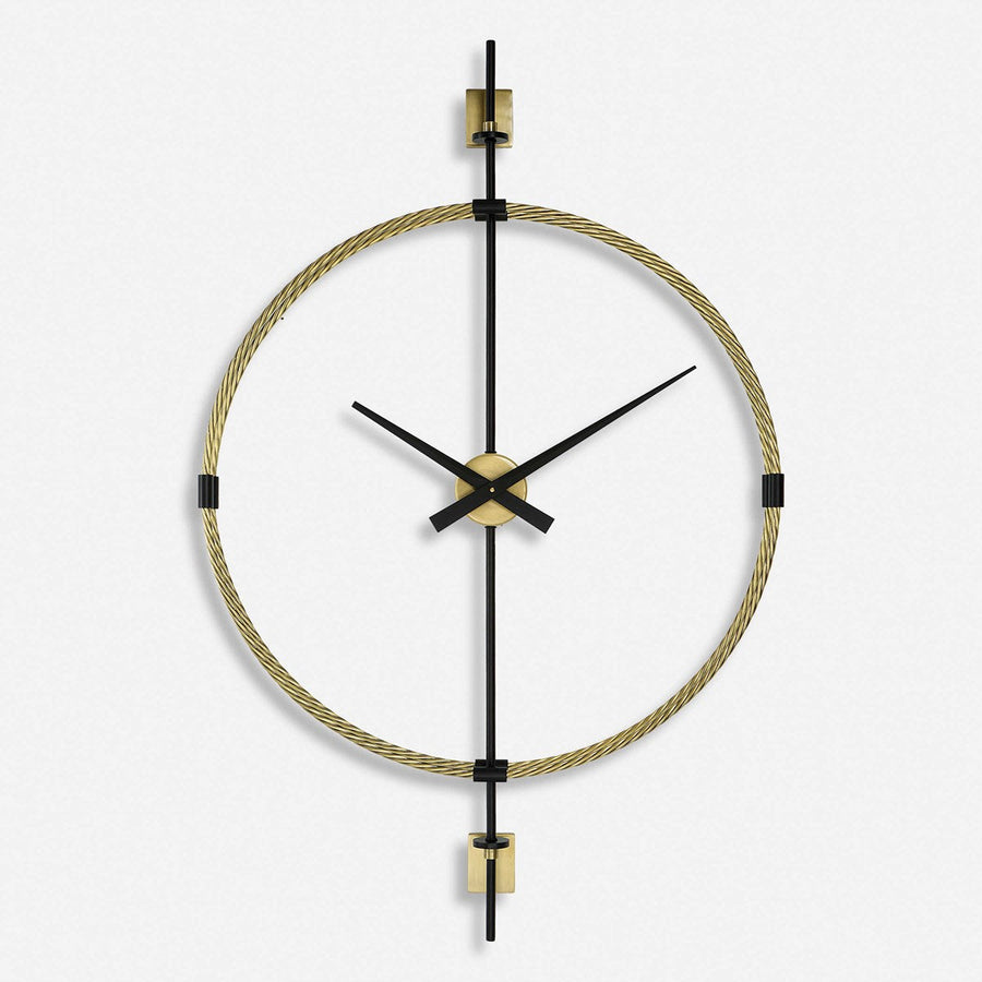 Timeless with a contemporary feel, this wall clock features a braided metal frame finished in brushed brass with satin black accents. Quartz movement ensures accurate timekeeping. Requires one "AA" battery.