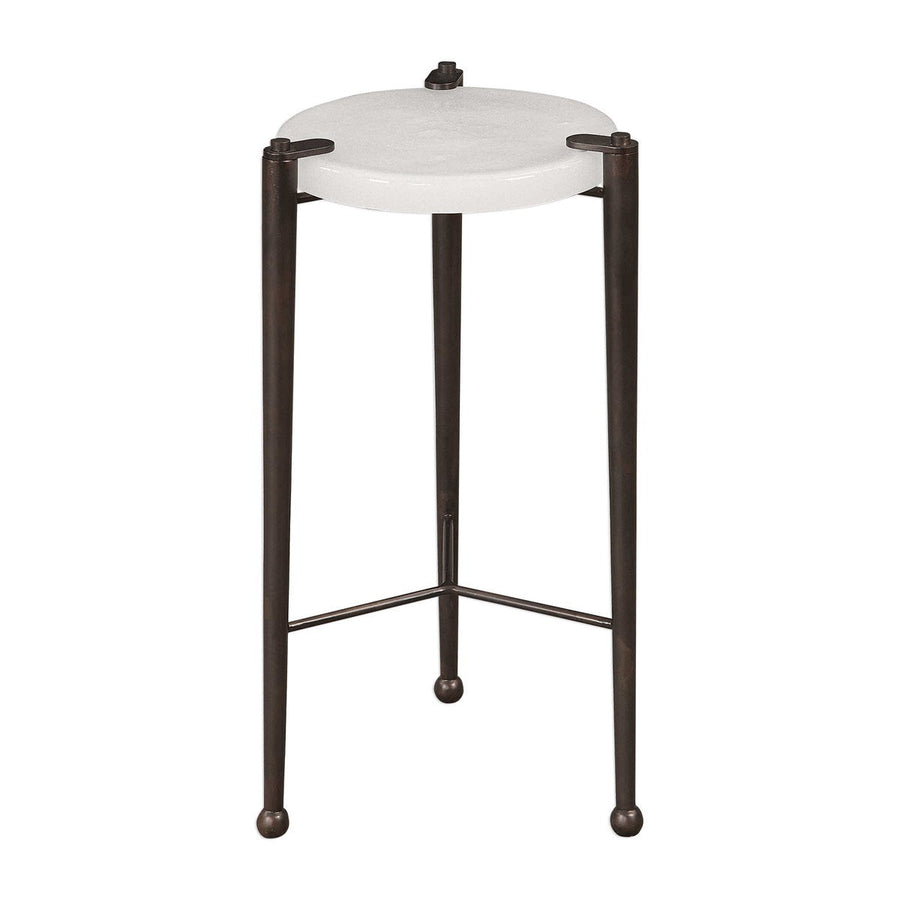 Thick hand polished art glass in a heavily seeded cloud white, suspended by an industrial inspired iron base with tapered legs accented by ball feet, finished in an acid oxidized dark bronze.