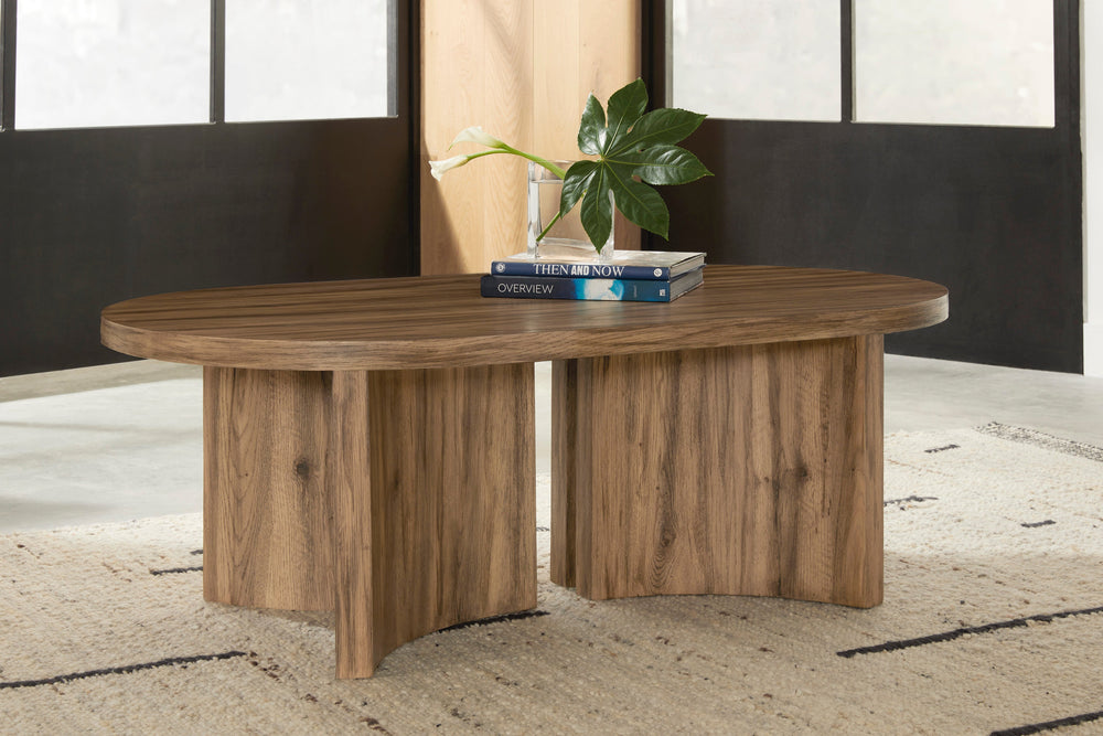 Showcasing an elevated, artistic silhouette, this coffee table expertly blends modern form and function. Its warm brown finish highlights the stunning wood grain, bringing an earthy element to staging decorative books or a chic centerpiece. Complete with a thick, substantial top, it’s a naturally beautiful living room staple in the making.