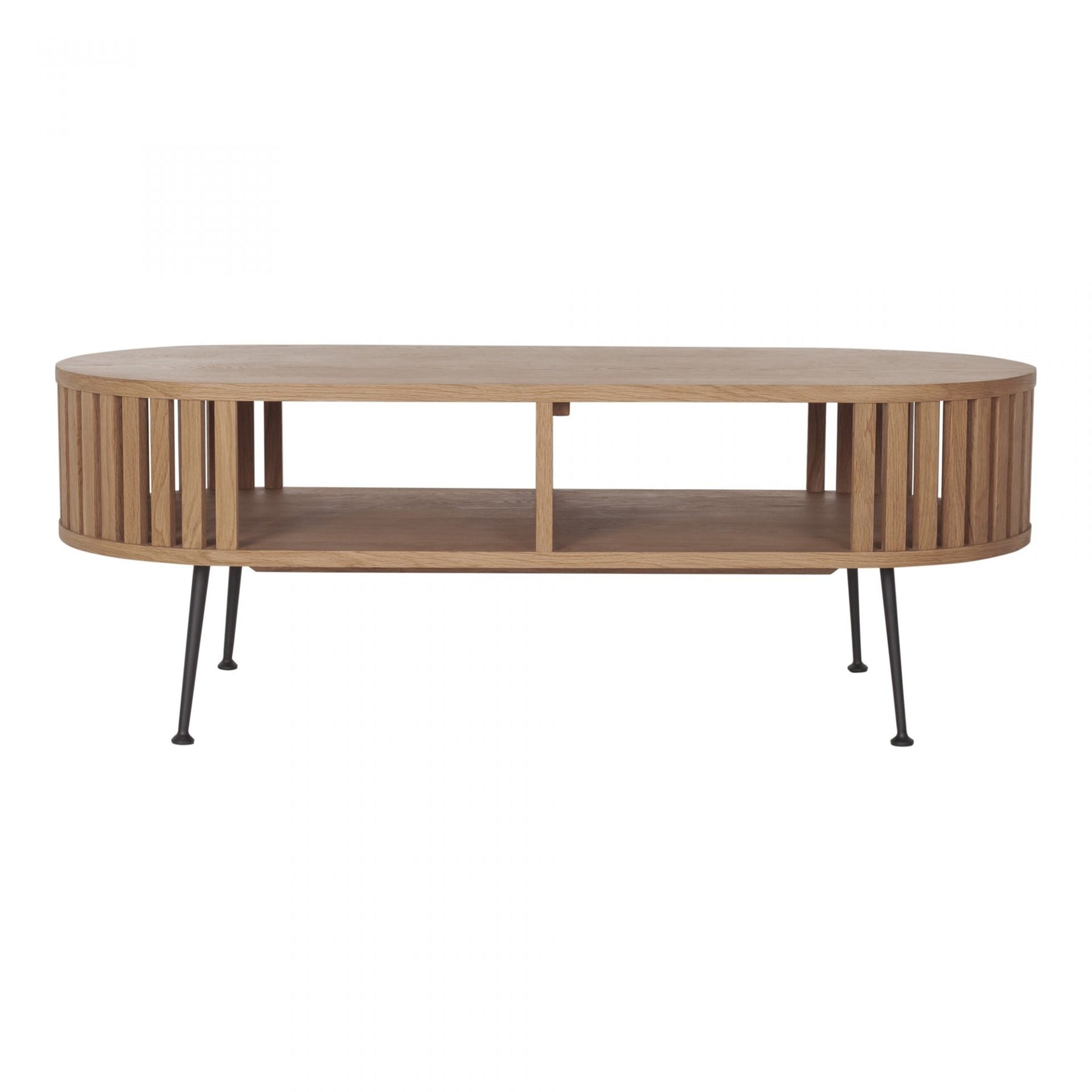 An entirely practical mid-century modern design with clean lines, tapered legs, and a gently rounded, smooth silhouette. This solid oak, lightly finished coffee table features gated paneling that details its spacious storage areas. A beautiful nod to 1950s décor, this versatile style works from room to room, centerfold as a coffee table or under the window with plants and sunlight.