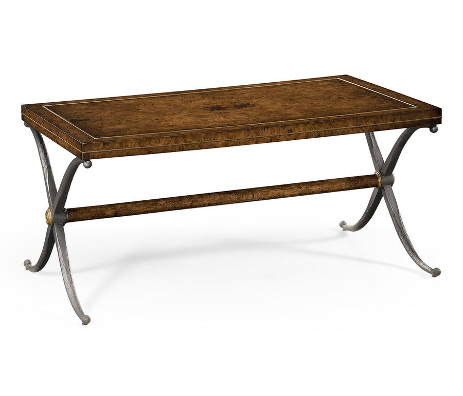 Burl oak veneered rectangular coffee table with inset brass beading, the X-frame support of hammered wrought iron and the stretcher with further veneer. (Old salescode: 494203)