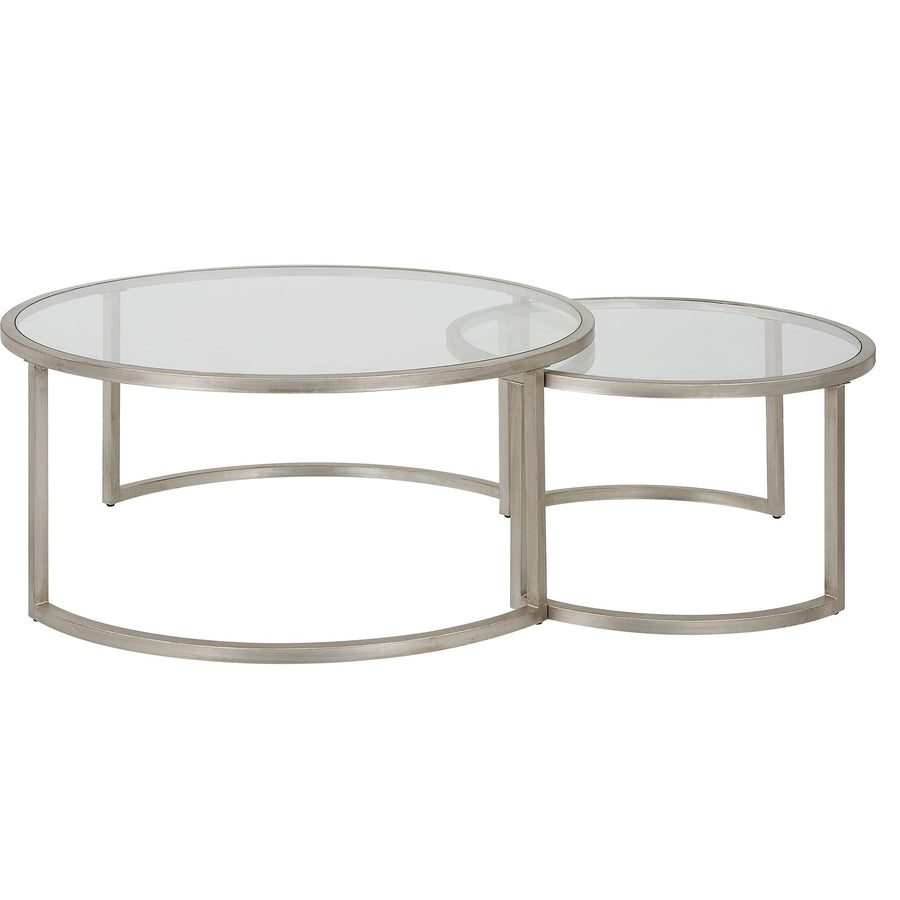Designed to nest as an oversized coffee table with the ability to completely separate, crafted from hand forged iron and finished in a heavily antiqued Silver leaf. Sizes: Sm-31x16, Lg-42x18