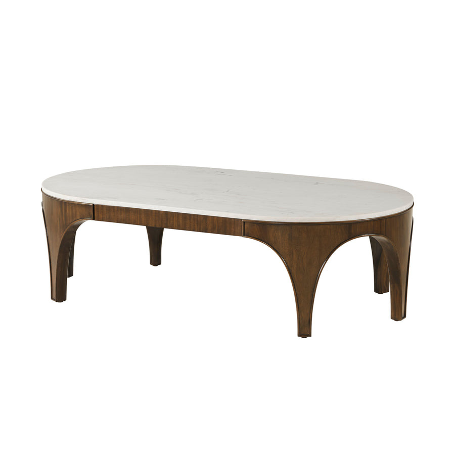 The Arlo Cocktail Table features a raised lip, highlighting the outline of the architectually inspired legs. This contemporary cocktail table, crafted from mahogany in our Gelato finish, boasts a light marble top that adds contrast.