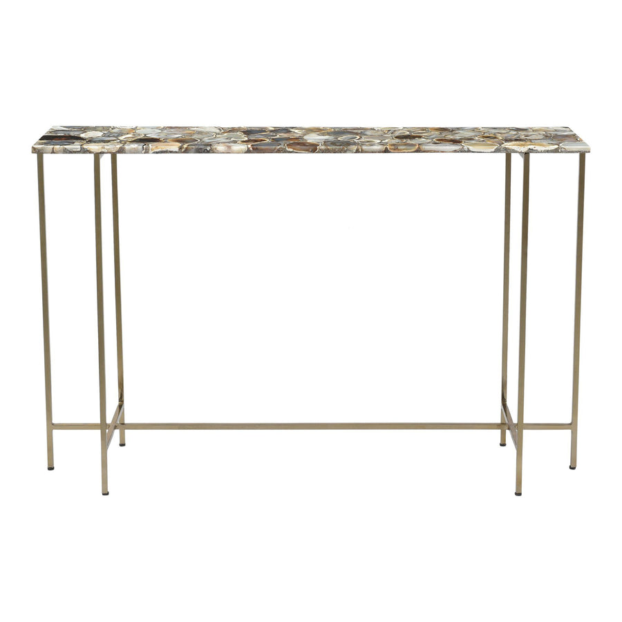 A console table that's worthy of being in a museum. The Agate Console Table's clear-cut agate tabletop reveals earthy tones of the stone's natural color and sparkle. Paired with a brass finished, solid iron frame, this table is both chic and sophisticated.