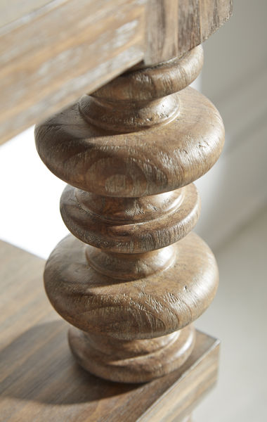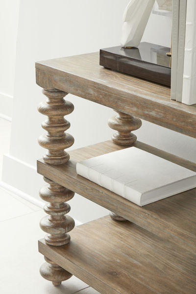 The elegant turned legs of the Architrave Console Table, a hallmark of the neoclassically-inspired Architrave collection, support a 72-inch top and two open shelves that can be used for storage or display. This handsome piece combines historical form and rustic charm in a casual classic style, and can be used as a narrow table behind a sofa or in a hallway.